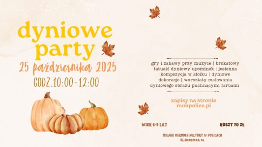 Zapraszamy na zwariowane party pod znakiem jesieni, którego główną bohaterką będzie wesoła, pomarańczowa dynia! Dołącz do naszej twórczej zabawy połączonej z warsztatami DIY i spędź sobotnie przedpołudnie w inspirujący sposób! Z pomocą instruktorek przygotuj w słoiku kompozycję pełną darów lasu, namaluj oryginalny dyniowy obraz puchnącymi farbami, weź udział w szalonych grach i zabawach i daj się ponieść fantazji, bawiąc się beztrosko przy wesołej muzyce. Nasza dyniowa zabawa będzie idealnym lekarstwem na październikową słotę – wyjdziesz z niej z szerokim uśmiechem na ustach, pięknymi wspomnieniami, brokatowym, jesiennym tatuażem i dyniowym upominkiem, który szykujemy specjalnie na tę okazję! Nie może Cię zabraknąć na naszym roześmianym party – czekamy właśnie na Ciebie!