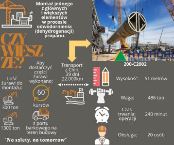 W dniu 26 kwietnia 2021 r. miało miejsce niezwykle ważne i widowiskowe przedsięwzięcie posadowienia jednego z większych elementów instalacji PDH tzw. kolumny rozdzielającej 200-C2002. Z uwagi znaczne rozmiary i środki zaangażowane do jej umiejscowienia można przy tej okazji śmiało mówić o niebagatelnym wydarzeniu logistycznym.