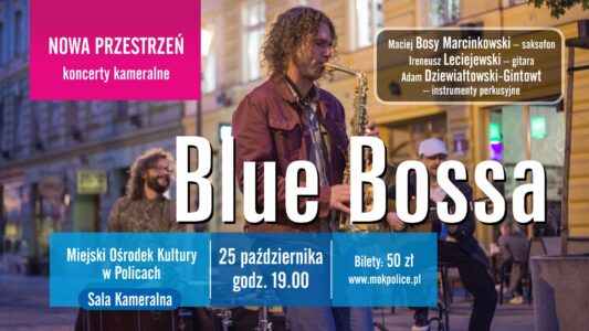 W sali kameralnej wybrzmią dźwięki sennej bossa novy, która koi, porusza, inspiruje i przenosi w czasie wprost do Ameryki Łacińskiej lat 60. ubiegłego wieku. W muzyczną podróż przez świat jazzu i brazylijskich rytmów publiczność zabierze zespół Blue Bossa – trzech utalentowanych artystów, którzy poruszą najwrażliwsze struny duszy!