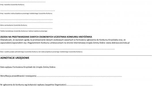 1) wydrukować formularz Krzyżówki, 2) prawidłowo rozwiązać Krzyżówkę (100%), 3) wpisać w oznaczone miejsce pod Krzyżówką hasło konkursowe, 4) dostarczyć druk wypełnionej Krzyżówki wraz z oznaczeniem imienia i nazwiska, adresu zamieszkania oraz numeru telefonu Uczestnika Konkursu, podpisanie klauzuli o zapoznaniu się z Regulaminem Konkursu oraz wyrażenia zgody na przetwarzanie danych osobowych w zakresie niezbędnym do przeprowadzenia Konkursu. 5. Termin na dostarczenie prawidłowego rozwiązania upływa w dniu 17.12.2021r. 6. Podpisany formularz rozwiązanej Krzyżówki można dostarczyć osobiście do Urzędu Gminy Dobra – Wydziału Spraw Obywatelskich w Wołczkowie przy u. Lipowej 51 w godzinach otwarcia Urzędu lub wysłać za pośrednictwem poczty (decyduje data stempla pocztowego) na adres : Urząd Gminy Dobra ul. Szczecińska 16A 72-003 Dobra, z dopiskiem KRZYŻÓWKA.