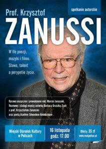 Krzysztof Zanussi to postać, której nie trzeba przedstawiać – wybitny reżyser, scenarzysta i filozof kina, twórca takich zapadających w pamięć obrazów jak Barwy ochronne, Życie jako śmiertelna choroba przenoszona drogą płciową czy Persona non grata. Jego twórczość dotykająca tematów wiary, moralności, zła i człowieczeństwa dała początek świeżemu spojrzeniu na rodzimą kinematografię i zainicjowała nowe nurty polskiego filmu: kino Młodej Kultury i kino moralnego niepokoju. Spotkanie pod nazwą W tle poezji, muzyki i filmu. Sława, talent a perypetie życia będzie miało wymiar wieloaspektowy – prócz rozmów o filmach, które bez wątpienia ukształtowały kolejne pokolenia polskich twórców, uczestnicy usłyszą również o życiu prywatnym reżysera, książkach nakreślających jego biografię i działalność zawodową, a także o muzyce, literaturze i znaczeniu słowa w kinie.