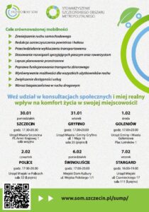 Konsultacje służyć będą upowszechnieniu wiedzy o idei zrównoważonej mobilności oraz wpływie opracowywanego dokumentu na jakość́ życia w regionie. Uczestnicy będą̨ mogli poznać́ cel tworzonego opracowania o nazwie Plan Zrównoważonej mobilności Szczecińskiego Obszaru Metropolitalnego do roku 2030 (z perspektywą 2040) jego ramy czasowe, zaangażowane zasoby, a także spodziewany efekt końcowy.